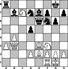 Partie-Notation im PGN-Format [Event "Open"] [Site "www.mySchach.de"] [Date "2016.01.17"] [Round "1"] [White "Naunhofer"] [Black "Joschi"] [ECO "A56"] [WhitemyELO "1695"] [BlackmyELO "1526"] [Result "1-0"] [TimeControl "10/1728000"] [WhiteDays "60"] [BlackDays "60"] [MySchachNr "102154"] 1. d4 Nf6 2. c4 c5 3. e3 cxd4 4. exd4 d5 5. c5 Nc6 6. Nf3 Qc7 7. Be2 e5 8. dxe5 Nxe5 9. b4 Ned7 10. O-O b6 11. cxb6 Qxb6 12. a3 Be7 13. Nc3 Bb7 14. Be3 Qd6 15. Rc1 O-O 16. Qb3 Rfc8 17. Nb5 Qe6 18. Rxc8+ Rxc8 19. Nxa7 Ra8 20. Nb5 g6 21. Nc7 1-0 Stellungs-Notation im FEN-Format r5k1/1bNnbp1p/4qnp1/3p4/1P6/PQ2BN2/3PBPPP/5RK1 - - - 1 21 Geschlagene Figuren Weiss: Geschlagene Figuren Schwarz: Klicken Sie auf eine geschlagene Figur um den gewünschten Zug darzustellen!