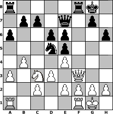 Partie-Notation im PGN-Format [Event "Sommertag"] [Site "www.mySchach.de"] [Date "2007.08.08"] [Round "2"] [White "steff"] [Black "MartinSilies"] [ECO "C48"] [WhitemyELO "1283"] [BlackmyELO "1355"] [Result "0-1"] [TimeControl "10/864000"] [WhiteDays "00"] [BlackDays "10"] [MySchachNr "37081"] 1. e4 e5 2. Nf3 Nc6 3. Nc3 Nf6 4. Bb5 Be7 5. d3 O-O 6. Bg5 d6 7. O-O a6 8. Bc4 h6 9. Bh4 Be6 10. Bxe6 fxe6 11. a3 Nd4 12. b4 Nxf3+ 13. Qxf3 Nd5 14. Bxe7 Qxe7 0-1 Stellungs-Notation im FEN-Format r4rk1/1pp1q1p1/p2pp2p/3np3/1P2P3/P1NP1Q2/2P1PPPP/R4RK1 - - - 0 15 Geschlagene Figuren Weiss: Geschlagene Figuren Schwarz: Klicken Sie auf eine geschlagene Figur um den gewünschten Zug darzustellen!