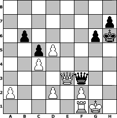 Partie-Notation im PGN-Format [Event "4. Windeck Open"] [Site "www.mySchach.de"] [Date "2011.06.29"] [Round "1"] [White "Tomino"] [Black "nogumo"] [ECO "A48"] [WhitemyELO "1755"] [BlackmyELO "1649"] [Result "1-0"] [TimeControl "10/864000"] [WhiteDays "30"] [BlackDays "32"] [MySchachNr "74852"] 1. d4 Nf6 2. Nf3 g6 3. Bf4 d6 4. e3 Bg7 5. h3 O-O 6. c4 c5 7. Nc3 b6 8. Be2 Bb7 9. d5 Nh5 10. Bh2 Nd7 11. O-O Re8 12. e4 Nf8 13. e5 dxe5 14. Nxe5 e6 15. Bxh5 exd5 16. Nxf7 Kxf7 17. Bf3 Bxc3 18. bxc3 Qf6 19. Qb3 Kg7 20. cxd5 Nd7 21. Rae1 Ba6 22. c4 Ne5 23. Bxe5 Rxe5 24. Rxe5 Qxe5 25. Qa4 Rf8 26. Qxa6 Rxf3 27. gxf3 Qg5+ 28. Kh1 Qf5 29. Qxa7+ Kh6 30. Qe7 Qxh3+ 31. Kg1 Qxf3 32. Qe3+ 1-0 Stellungs-Notation im FEN-Format 8/7p/1p4pk/2pP4/2P5/4Qq2/P2P1P2/5RK1 - - - 1 32 Geschlagene Figuren Weiss: Geschlagene Figuren Schwarz: Klicken Sie auf eine geschlagene Figur um den gewünschten Zug darzustellen!