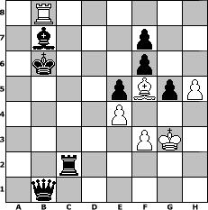 Partie-Notation im PGN-Format [Event "Nimzo-Indisch"] [Site "www.mySchach.de"] [Date "2011.10.17"] [Round "1"] [White "Gauss1233"] [Black "reisender"] [ECO "E32"] [WhitemyELO "1428"] [BlackmyELO "1403"] [Result "0-1"] [TimeControl "10/2592000"] [WhiteDays "122"] [BlackDays "148"] [MySchachNr "76932"] 1. d4 Nf6 2. c4 e6 3. Nc3 Bb4 4. Qc2 O-O 5. a3 Bxc3+ 6. Qxc3 b6 7. Qf3 c6 8. Bg5 d5 9. Bxf6 Qxf6 10. Qxf6 gxf6 11. g3 Rd8 12. cxd5 Rxd5 13. e3 Kf8 14. Bg2 Rd6 15. Rc1 Bb7 16. b4 b5 17. Nh3 a5 18. Nf4 axb4 19. axb4 Ra4 20. Rb1 Na6 21. Nd3 Ra3 22. Nc5 Nxc5 23. bxc5 Rd8 24. O-O Rda8 25. e4 R8a4 26. d5 Rc4 27. dxc6 Bxc6 28. Rfc1 Rac3 29. Rxc3 Rxc3 30. f3 Rxc5 31. Rb2 Ke7 32. Kf2 e5 33. h4 Ke6 34. Bh3+ Kd6 35. Rd2+ Kc7 36. Ke3 Kb6 37. Bf5 h6 38. Rd8 b4 39. Rf8 Rc3+ 40. Kf2 b3 41. g4 Rc2+ 42. Kg3 b2 43. g5 hxg5 44. h5 b1=Q 45. Rb8+ Bb7 0-1 Stellungs-Notation im FEN-Format 1R6/1b3p2/1k3p2/4pBpP/4P3/5PK1/2r5/1q6 - - - 2 46 Geschlagene Figuren Weiss: Geschlagene Figuren Schwarz: Klicken Sie auf eine geschlagene Figur um den gewünschten Zug darzustellen!