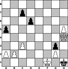 Partie-Notation im PGN-Format [Event "Einfach nur Schach 8"] [Site "www.mySchach.de"] [Date "2025.11.14"] [Round "2"] [White "Lohl"] [Black "Achimkogge"] [ECO "C24"] [WhitemyELO "1283"] [BlackmyELO "1241"] [Result "1-0"] [TimeControl "10/864000"] [WhiteDays "50"] [BlackDays "37"] [MySchachNr "133941"] 1. e4 e5 2. Bc4 Nf6 3. d4 Nxe4 4. Bxf7+ Kxf7 5. Qh5+ g6 6. Qxe5 Nf6 7. Nf3 Bb4+ 8. c3 Bd6 9. Qg5 h6 10. Ne5+ Bxe5 11. Qxe5 d6 12. Qf4 Qe7+ 13. Be3 g5 14. Qf3 Nc6 15. d5 Ne5 16. Qe2 Nxd5 17. O-O Nxe3 18. Qxe3 Rf8 19. Nd2 Bf5 20. Qe2 Bg4 21. f3 Nxf3+ 22. Rxf3+ Bxf3 23. Qxf3+ Kg7 24. Qxb7 Qe1+ 25. Rxe1 Kg6 26. Re6+ Kh5 27. Qe4 Rf4 28. Qg6+ Kg4 29. h3+ Kg3 30. Nf1+ Rxf1+ 31. Kxf1 Rf8+ 32. Rf6 Rd8 33. Rf3+ Kh2 34. Qxh6 Rg8 35. h4 g4 36. Rf8 Rxf8+ 37. Qxf8 g3 38. h5 a5 39. Qd8 Kh1 40. Qh4# 1-0 Stellungs-Notation im FEN-Format 8/2p5/3p4/p6P/7Q/2P3p1/PP4P1/5K1k - - - 3 40 Geschlagene Figuren Weiss: Geschlagene Figuren Schwarz: Klicken Sie auf eine geschlagene Figur um den gewünschten Zug darzustellen!