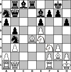 Partie-Notation im PGN-Format [Event "Katalanisch"] [Site "www.mySchach.de"] [Date "2012.06.11"] [Round "2"] [White "Tigerle"] [Black "lasker"] [ECO "E06"] [WhitemyELO "1519"] [BlackmyELO "1417"] [Result "1-0"] [TimeControl "10/1728000"] [WhiteDays "20"] [BlackDays "00"] [MySchachNr "82172"] 1. d4 Nf6 2. c4 e6 3. g3 d5 4. Bg2 Be7 5. Nf3 O-O 6. O-O h6 7. Qc2 Nc6 8. Nbd2 dxc4 9. Qxc4 a6 10. e4 Rb8 11. b3 Re8 12. e5 Nd5 13. Ne4 Na7 14. Kh1 b5 15. Qd3 c5 16. Bb2 cxd4 17. Qxd4 Qb6 18. Qd2 Rd8 19. Bd4 Qb7 20. Qc2 Nb4 21. Qb1 1-0 Stellungs-Notation im FEN-Format 1rbr2k1/nq2bpp1/p3p2p/1p2P3/1n1BN3/1P3NP1/P4PBP/RQ3R1K - - - 8 21 Geschlagene Figuren Weiss: Geschlagene Figuren Schwarz: Klicken Sie auf eine geschlagene Figur um den gewünschten Zug darzustellen!