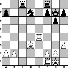 Partie-Notation im PGN-Format [Event "OhneEngine vom Fr"] [Site "www.mySchach.de"] [Date "2010.04.23"] [Round "2"] [White "Hannes"] [Black "Haki"] [ECO "A22"] [WhitemyELO "1414"] [BlackmyELO "1262"] [Result "0-1"] [TimeControl "10/2592000"] [WhiteDays "00"] [BlackDays "30"] [MySchachNr "65054"] 1. c4 e5 2. Nc3 Nf6 3. e3 c5 4. Nf3 Nc6 5. d4 exd4 6. exd4 cxd4 7. Nxd4 Bc5 8. Nxc6 bxc6 9. Bd3 O-O 10. O-O d5 11. Bg5 Be7 12. h3 Qd6 13. cxd5 Nxd5 14. Bxe7 Qxe7 15. Qc2 Qg5 16. Ne4 Qe5 17. Nc5 g6 18. Rae1 Qg5 19. Ne4 Qh4 20. Qxc6 Nb6 21. Re3 Bd7 22. Nf6+ Kg7 23. Nxd7 Rac8 24. Qe4 Qxe4 25. Rxe4 Nxd7 0-1 Stellungs-Notation im FEN-Format 2r2r2/p2n1pkp/6p1/8/4R3/3B3P/PP3PP1/5RK1 - - - 0 26 Geschlagene Figuren Weiss: Geschlagene Figuren Schwarz: Klicken Sie auf eine geschlagene Figur um den gewünschten Zug darzustellen!