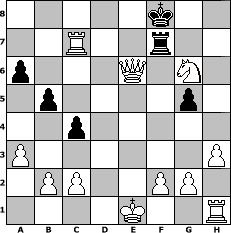 Partie-Notation im PGN-Format [Event "9er10"] [Site "www.mySchach.de"] [Date "2025.11.20"] [Round "1"] [White "Winston"] [Black "Achimkogge"] [ECO "C20"] [WhitemyELO "1505"] [BlackmyELO "1235"] [Result "1-0"] [TimeControl "10/3456000"] [WhiteDays "40"] [BlackDays "40"] [MySchachNr "133970"] 1. e4 e5 2. a3 Nf6 3. Nc3 c6 4. Nf3 d6 5. h3 b5 6. d4 Be6 7. dxe5 Nh5 8. exd6 Bxd6 9. Be2 h6 10. Nd4 Bc4 11. Bxh5 g6 12. Be2 Bxe2 13. Qxe2 Be5 14. Nf3 Bf6 15. e5 Be7 16. Qe4 a6 17. Bf4 g5 18. Rd1 Qc7 19. Bh2 Nd7 20. e6 Nf6 21. Qf5 fxe6 22. Qg6+ Kf8 23. Bxc7 Rh7 24. Ne5 Rc8 25. Nd7+ Nxd7 26. Rxd7 Rf7 27. Qxh6+ Ke8 28. Qxe6 Rxc7 29. Rxc7 c5 30. Nd5 Kf8 31. Nxe7 c4 32. Ng6+ 1-0 Stellungs-Notation im FEN-Format 5k2/2R2r2/p3Q1N1/1p4p1/2p5/P6P/1PP2PP1/4K2R - K - 1 32 Geschlagene Figuren Weiss: Geschlagene Figuren Schwarz: Klicken Sie auf eine geschlagene Figur um den gewünschten Zug darzustellen!