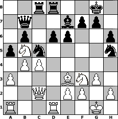 Partie-Notation im PGN-Format [Event "2. HSF-Clubmeisterschaft 2011/12; Gruppe A"] [Site "www.mySchach.de"] [Date "2011.09.01"] [Round "1"] [White "mizuho"] [Black "UPS"] [ECO "A13"] [WhitemyELO "1529"] [BlackmyELO "1682"] [Result "1/2-1/2"] [TimeControl "10/2592000"] [WhiteDays "21"] [BlackDays "25"] [MySchachNr "75938"] 1. c4 e6 2. g3 c5 3. d4 cxd4 4. Qxd4 Nc6 5. Qg4 Nf6 6. Qg5 h6 7. Qe3 b6 8. Nf3 Nb4 9. Qb3 Bb7 10. Bg2 Be7 11. Bd2 a5 12. Nc3 O-O 13. a3 Na6 14. O-O Nc5 15. Qc2 Rc8 16. Rfe1 Nce4 17. Ne5 Nc5 18. Bxb7 Nxb7 19. b3 Qc7 20. Bf4 d6 21. Nf3 Nh5 22. Be3 Nc5 23. Nb5 Qb7 24. Red1 Rfd8 25. b4 1/2-1/2 Stellungs-Notation im FEN-Format 2rr2k1/1q2bpp1/1p1pp2p/pNn4n/1PP5/P3BNP1/2Q1PP1P/R2R2K1 - - - 0 25 Geschlagene Figuren Weiss: Geschlagene Figuren Schwarz: Klicken Sie auf eine geschlagene Figur um den gewünschten Zug darzustellen!