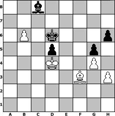 Partie-Notation im PGN-Format [Event "Schach f"] [Site "www.mySchach.de"] [Date "2008.08.25"] [Round "1"] [White "nogumo"] [Black "RashimIbenRohal"] [ECO "A00"] [WhitemyELO "1701"] [BlackmyELO "1529"] [Result "1/2-1/2"] [TimeControl "10/2592000"] [WhiteDays "30"] [BlackDays "30"] [MySchachNr "47410"] 1. Nh3 d5 2. g3 e5 3. Bg2 Nf6 4. f4 Bd6 5. O-O O-O 6. fxe5 Bxe5 7. d4 Bd6 8. Nf2 Re8 9. Bg5 c6 10. c3 Be6 11. e4 Be7 12. e5 Nfd7 13. Bxe7 Qxe7 14. Nd2 f6 15. exf6 Nxf6 16. Nd3 Nbd7 17. Nb3 b6 18. Qd2 Qd6 19. Rae1 Bf7 20. Nbc1 Ne4 21. Qf4 Qxf4 22. Nxf4 c5 23. dxc5 bxc5 24. Re2 Ndf6 25. Rfe1 Rad8 26. Ncd3 a5 27. Nf2 Nxf2 28. Rxe8+ Rxe8 29. Rxe8+ Bxe8 30. Kxf2 Bf7 31. h3 Kf8 32. Ke3 Ke7 33. a3 Kd6 34. b4 axb4 35. axb4 cxb4 36. cxb4 Nd7 37. Kd4 Nb6 38. Nd3 g5 39. Ne5 Be6 40. g4 h6 41. Nd3 Bd7 42. Nc5 Bc6 43. Bf1 Nd7 44. Nxd7 Bxd7 45. Bd3 Be8 46. Be2 Bg6 47. Bf3 Bf7 48. b5 Be8 49. Be2 Bd7 50. b6 Bc8 51. Bf3 1/2-1/2 Stellungs-Notation im FEN-Format 2b5/8/1P1k3p/3p2p1/3K2P1/5B1P/8/8 - - - 2 51 Geschlagene Figuren Weiss: Geschlagene Figuren Schwarz: Klicken Sie auf eine geschlagene Figur um den gewünschten Zug darzustellen!