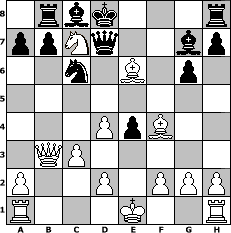 Partie-Notation im PGN-Format [Event "Finale"] [Site "www.mySchach.de"] [Date "2014.07.12"] [Round "1"] [White "Cuibono"] [Black "Knight"] [ECO "A85"] [WhitemyELO "1984"] [BlackmyELO "1257"] [Result "1-0"] [TimeControl "10/2592000"] [WhiteDays "59"] [BlackDays "60"] [MySchachNr "95122"] 1. d4 f5 2. c4 Nf6 3. Nc3 d5 4. cxd5 Nxd5 5. e4 Nxc3 6. bxc3 g6 7. Qb3 Bg7 8. Nf3 fxe4 9. Ng5 e6 10. Nxe6 Qd7 11. Bc4 Nc6 12. Bf4 Rb8 13. Nxc7+ Kd8 14. Be6 1-0 Stellungs-Notation im FEN-Format 1rbk3r/ppNq2bp/2n1B1p1/8/3PpB2/1QP5/P2P1PPP/R3K2R - KQ - 2 14 Geschlagene Figuren Weiss: Geschlagene Figuren Schwarz: Klicken Sie auf eine geschlagene Figur um den gewünschten Zug darzustellen!