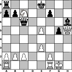 Partie-Notation im PGN-Format [Event "Sommer"] [Site "www.mySchach.de"] [Date "2015.07.14"] [Round "1"] [White "lotchi"] [Black "Geisterreiter"] [ECO "A06"] [WhitemyELO "1275"] [BlackmyELO "1411"] [Result "1-0"] [TimeControl "10/1728000"] [WhiteDays "13"] [BlackDays "36"] [MySchachNr "99688"] 1. Nf3 d5 2. d4 Nc6 3. Nc3 Nf6 4. Bg5 Ng4 5. h3 Nf6 6. e3 Bf5 7. Bxf6 exf6 8. Bb5 Qd6 9. Bxc6+ Qxc6 10. O-O g5 11. g4 Bxg4 12. hxg4 h5 13. gxh5 Rxh5 14. Ne5 fxe5 15. Qxh5 Bh6 16. dxe5 Qe6 17. Nxd5 Qc6 18. Nxc7+ 1-0 Stellungs-Notation im FEN-Format r3k3/ppN2p2/2q4b/4P1pQ/8/4P3/PPP2P2/R4RK1 - q - 0 18 Geschlagene Figuren Weiss: Geschlagene Figuren Schwarz: Klicken Sie auf eine geschlagene Figur um den gewünschten Zug darzustellen!
