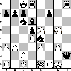Partie-Notation im PGN-Format [Event "Sommer bis Herbst"] [Site "www.mySchach.de"] [Date "2015.07.25"] [Round "1"] [White "hape50"] [Black "Schefsche"] [ECO "A40"] [WhitemyELO "1323"] [BlackmyELO "1467"] [Result "0-1"] [TimeControl "10/1728000"] [WhiteDays "39"] [BlackDays "40"] [MySchachNr "99831"] 1. d4 e5 2. e3 e4 3. g3 d5 4. Bg2 Nf6 5. Ne2 Bg4 6. O-O Qd7 7. Qe1 Nc6 8. a3 Bd6 9. f4 exf3 10. Bxf3 h5 11. Nd2 h4 12. b3 O-O-O 13. Nf4 g5 14. Nd3 hxg3 15. hxg3 Bxf3 16. Nxf3 Qh3 17. Nde5 Ne4 18. Nxg5 Qh2# 0-1 Stellungs-Notation im FEN-Format 2kr3r/ppp2p2/2nb4/3pN1N1/3Pn3/PP2P1P1/2P4q/R1B1QRK1 - - - 1 19 Geschlagene Figuren Weiss: Geschlagene Figuren Schwarz: Klicken Sie auf eine geschlagene Figur um den gewünschten Zug darzustellen!