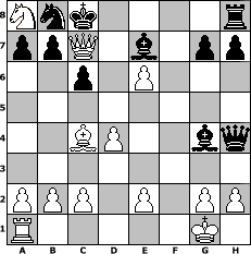Partie-Notation im PGN-Format [Event "Rechnerfrei A"] [Site "www.mySchach.de"] [Date "2010.02.05"] [Round "1"] [White "Caligula"] [Black "fred521"] [ECO "C34"] [WhitemyELO "1420"] [BlackmyELO "1326"] [Result "1-0"] [TimeControl "10/1728000"] [WhiteDays "59"] [BlackDays "28"] [MySchachNr "62895"] 1. e4 e5 2. f4 exf4 3. Nf3 d6 4. d4 Nf6 5. Bd3 Qe7 6. Nc3 Bg4 7. O-O Nh5 8. Bxf4 Nxf4 9. Bc4 Qf6 10. Qd2 c6 11. e5 Qf5 12. Nh4 Qg5 13. Rxf4 Qxh4 14. Rxf7 d5 15. Nxd5 Kxf7 16. Nc7+ Ke7 17. Nxa8 Kd7 18. Qf4 Be7 19. e6+ Kc8 20. Qc7# 1-0 Stellungs-Notation im FEN-Format Nnk4r/ppQ1b1pp/2p1P3/8/2BP2bq/8/PPP1P1PP/R5K1 - - - 2 20 Geschlagene Figuren Weiss: Geschlagene Figuren Schwarz: Klicken Sie auf eine geschlagene Figur um den gewünschten Zug darzustellen!