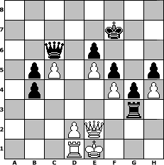 Partie-Notation im PGN-Format [Event "Bremer Schl"] [Site "www.mySchach.de"] [Date "2008.11.01"] [Round "2"] [White "deepsabel"] [Black "Fighter"] [ECO "D15"] [WhitemyELO "1924"] [BlackmyELO "2087"] [Result "0-1"] [TimeControl "10/2592000"] [WhiteDays "116"] [BlackDays "120"] [MySchachNr "49424"] 1. d4 d5 2. c4 c6 3. Nf3 Nf6 4. Nc3 e6 5. Bg5 h6 6. Bh4 dxc4 7. e4 g5 8. Bg3 b5 9. Be2 Bb7 10. h4 g4 11. Ne5 h5 12. O-O Nbd7 13. Qc2 Nxe5 14. Bxe5 Bg7 15. b3 cxb3 16. axb3 O-O 17. Rfd1 Ne8 18. Bxg7 Nxg7 19. g3 f5 20. e5 a6 21. Bf1 c5 22. dxc5 Qc7 23. Ne2 Qc6 24. f4 Rfd8 25. b4 Rxd1 26. Qxd1 Qf3 27. Qd4 Ne8 28. Qc3 Qh1+ 29. Kf2 Rd8 30. Qe3 Be4 31. Ke1 Nc7 32. Qf2 Bc6 33. Qe3 Kf7 34. Rc1 Nd5 35. Qb3 a5 36. Rd1 axb4 37. Nd4 Ra8 38. Nxc6 Ra3 39. Qb2 Ne3 40. Qf2 Nxf1 41. Qxf1 Qxc6 42. Qe2 Rxg3 0-1 Stellungs-Notation im FEN-Format 8/5k2/2q1p3/1pP1Pp1p/1p3PpP/6r1/3PQ3/3RK3 - - - 0 43 Geschlagene Figuren Weiss: Geschlagene Figuren Schwarz: Klicken Sie auf eine geschlagene Figur um den gewünschten Zug darzustellen!