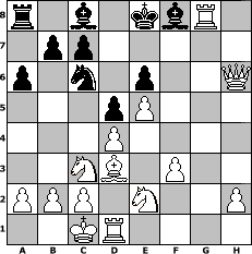 Partie-Notation im PGN-Format [Event "Trompowsky-Angriff"] [Site "www.mySchach.de"] [Date "2011.04.27"] [Round "1"] [White "Caligula"] [Black "Duesentrieb"] [ECO "A45"] [WhitemyELO "1279"] [BlackmyELO "1197"] [Result "1-0"] [TimeControl "10/2592000"] [WhiteDays "90"] [BlackDays "78"] [MySchachNr "73573"] 1. d4 Nf6 2. Bg5 Ne4 3. Bf4 d5 4. f3 Nf6 5. Nc3 e6 6. e4 Bb4 7. e5 Nh5 8. Be3 O-O 9. Bd3 Nc6 10. Qd2 a6 11. O-O-O Qe7 12. g4 f5 13. gxh5 h6 14. Nge2 g5 15. hxg6 f4 16. Bxf4 Kg7 17. Bxh6+ Kh8 18. g7+ Kg8 19. gxf8=Q+ Qxf8 20. Bxf8 Kxf8 21. Qh6+ Ke8 22. Rhg1 Bf8 23. Rg8 1-0 Stellungs-Notation im FEN-Format r1b1kbR1/1pp5/p1n1p2Q/3pP3/3P4/2NB1P2/PPP1N2P/2KR4 - - - 5 23 Geschlagene Figuren Weiss: Geschlagene Figuren Schwarz: Klicken Sie auf eine geschlagene Figur um den gewünschten Zug darzustellen!