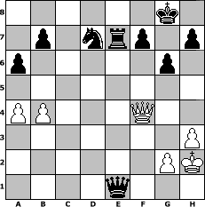 Partie-Notation im PGN-Format [Event "Schach dem Osterhasen IV"] [Site "www.mySchach.de"] [Date "2015.03.29"] [Round "1"] [White "Caligula"] [Black "Andylein1989"] [ECO "C30"] [WhitemyELO "1385"] [BlackmyELO "1499"] [Result "0-1"] [TimeControl "10/2592000"] [WhiteDays "96"] [BlackDays "97"] [MySchachNr "98701"] 1. e4 e5 2. f4 d6 3. Nf3 Nc6 4. Bb5 exf4 5. d4 Bd7 6. Bxf4 Be7 7. Bc4 Na5 8. Bd3 Nf6 9. b4 Nc6 10. c3 O-O 11. d5 Nb8 12. a4 a6 13. O-O Nh5 14. Be3 Qc8 15. e5 g6 16. exd6 Bxd6 17. Nbd2 c6 18. dxc6 Bxc6 19. Be2 Re8 20. Nc4 Bc7 21. Bc5 Nd7 22. Bd6 Rxe2 23. Qxe2 Bxf3 24. Qxf3 Bb6+ 25. Kh1 Qxc4 26. Rae1 Ng7 27. Re7 Nf5 28. Rf2 Bxf2 29. Qxf2 Nxe7 30. Bxe7 Qxc3 31. h3 Re8 32. Qf4 Qe1+ 33. Kh2 Rxe7 0-1 Stellungs-Notation im FEN-Format 6k1/1p1nrp1p/p5p1/8/PP3Q2/7P/6PK/4q3 - - - 0 34 Geschlagene Figuren Weiss: Geschlagene Figuren Schwarz: Klicken Sie auf eine geschlagene Figur um den gewünschten Zug darzustellen!