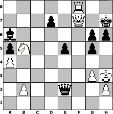 Partie-Notation im PGN-Format [Event "^^Frohes neues Jahr^^"] [Site "www.mySchach.de"] [Date "2007.12.29"] [Round "1"] [White "Helmut48"] [Black "crca108"] [ECO "B12"] [WhitemyELO "1395"] [BlackmyELO "1377"] [Result "1-0"] [TimeControl "10/864000"] [WhiteDays "39"] [BlackDays "39"] [MySchachNr "41115"] 1. e4 c6 2. d4 Nf6 3. e5 Nd5 4. c4 Nb4 5. a3 N4a6 6. c5 Nc7 7. Nc3 e6 8. Nf3 h6 9. Be2 b6 10. Bd2 bxc5 11. dxc5 Bxc5 12. Be3 Bxe3 13. fxe3 Nd5 14. Nxd5 cxd5 15. O-O Qb6 16. Qd2 Nc6 17. Qc3 a5 18. Rab1 Ne7 19. Nd4 Ng6 20. Nb5 O-O 21. g3 Bb7 22. Qd4 Qd8 23. Bh5 Ba6 24. a4 Qb8 25. Bxg6 fxg6 26. Qc5 Qxe5 27. Qd4 Qg5 28. Rxf8+ Rxf8 29. Rf1 e5 30. Qxd5+ Kh7 31. Rxf8 Qxe3+ 32. Kg2 Qe2+ 33. Kh3 g5 34. Qg8+ Kg6 35. Qf7+ Kh7 36. Qf5+ g6 37. Qf7# 1-0 Stellungs-Notation im FEN-Format 5R2/3p1Q1k/b5pp/pN2p1p1/P7/6PK/1P2q2P/8 - - - 1 37 Geschlagene Figuren Weiss: Geschlagene Figuren Schwarz: Klicken Sie auf eine geschlagene Figur um den gewünschten Zug darzustellen!