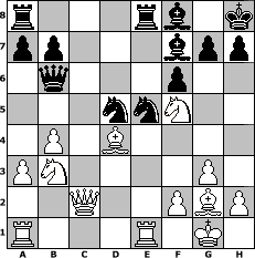 Partie-Notation im PGN-Format [Event "Bremer Schl"] [Site "www.mySchach.de"] [Date "2010.10.15"] [Round "1"] [White "Fedkopv"] [Black "dbuse"] [ECO "A30"] [WhitemyELO "1941"] [BlackmyELO "2123"] [Result "1/2-1/2"] [TimeControl "10/3456000"] [WhiteDays "85"] [BlackDays "88"] [MySchachNr "68971"] 1. c4 c5 2. g3 Nf6 3. Bg2 d5 4. cxd5 Nxd5 5. Nc3 Nc7 6. Nf3 Nc6 7. O-O e5 8. a3 f6 9. e3 Be7 10. d4 cxd4 11. exd4 exd4 12. Ne2 Ne6 13. b4 O-O 14. Bb2 d3 15. Nc1 Qb6 16. Qxd3 Kh8 17. Bc3 Rd8 18. Qe2 Nc7 19. Nb3 Re8 20. Rfe1 Be6 21. Qc2 Bf7 22. Nfd4 Nd5 23. Bb2 Ne5 24. Nf5 Bf8 25. Bd4 1/2-1/2 Stellungs-Notation im FEN-Format r3rb1k/pp3bpp/1q3p2/3nnN2/1P1B4/PN4P1/2Q2PBP/R3R1K1 - - - 18 25 Geschlagene Figuren Weiss: Geschlagene Figuren Schwarz: Klicken Sie auf eine geschlagene Figur um den gewünschten Zug darzustellen!