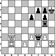 Partie-Notation im PGN-Format [Event "Turnier zum Winterende"] [Site "www.mySchach.de"] [Date "2006.02.18"] [Round "2"] [White "nogumo"] [Black "romain63"] [ECO "A00"] [WhitemyELO "1666"] [BlackmyELO "1802"] [Result "0-1"] [TimeControl "10/2592000"] [WhiteDays "147"] [BlackDays "111"] [MySchachNr "22621"] 1. b4 a5 2. b5 d5 3. Bb2 Bf5 4. e3 Nd7 5. Nf3 e6 6. Be2 Ngf6 7. Nh4 Bg6 8. Nxg6 hxg6 9. c4 dxc4 10. Bxc4 Nb6 11. Be2 Bd6 12. Bf3 Rb8 13. Qc2 Qd7 14. Na3 O-O 15. O-O Rfc8 16. Rab1 Bxa3 17. Bxa3 Nfd5 18. Rfc1 c6 19. bxc6 Rxc6 20. Qd1 Nc4 21. Bb2 Nxb2 22. Rxb2 b5 23. Be2 b4 24. Rbc2 Rxc2 25. Qxc2 a4 26. h4 b3 27. axb3 axb3 28. Qb2 Qa4 29. Rb1 Qxh4 30. Bf3 Qc4 31. Qe5 Rb5 32. Bxd5 Qc2 33. Rb2 Qd1+ 34. Kh2 Rxd5 35. Qb8+ Kh7 36. Qxb3 Rh5+ 37. Kg3 Rg5+ 38. Kh2 Qg4 39. g3 Qf3 0-1 Stellungs-Notation im FEN-Format 8/5ppk/4p1p1/6r1/8/1Q2PqP1/1R1P1P1K/8 - - - 1 40 Geschlagene Figuren Weiss: Geschlagene Figuren Schwarz: Klicken Sie auf eine geschlagene Figur um den gewünschten Zug darzustellen!