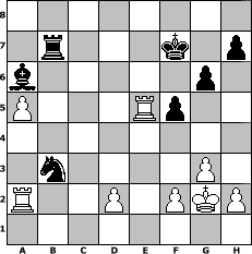 Partie-Notation im PGN-Format [Event "Chess for beginners"] [Site "www.mySchach.de"] [Date "2006.09.27"] [Round "1"] [Board "3"] [White "reisinger"] [Black "mickey"] [ECO "A50"] [WhitemyELO "1628"] [BlackmyELO "1519"] [Result "1/2-1/2"] [TimeControl "10/2592000"] [WhiteDays "30"] [BlackDays "30"] [MySchachNr "28975"] 1. d4 Nf6 2. c4 d5 3. Nc3 e6 4. c5 Be7 5. Nf3 O-O 6. Qc2 b6 7. b4 a5 8. Ba3 axb4 9. Bxb4 bxc5 10. dxc5 Nc6 11. Qb2 Nxb4 12. Qxb4 Ba6 13. Nd4 Qd7 14. a4 Rfb8 15. Qa3 c6 16. g3 Rb7 17. Bh3 Qc7 18. O-O e5 19. Nf5 Rab8 20. Rfe1 Rb3 21. Qc1 d4 22. Qg5 g6 23. Ne4 Nxe4 24. Qxe7 Qxe7 25. Nxe7+ Kf8 26. Nxc6 Re8 27. Bd7 Ra8 28. Nxe5 Nxc5 29. Bc6 Rc8 30. Bd5 f6 31. Bxb3 Nxb3 32. Ra3 Rc3 33. Nd7+ Ke7 34. Nc5 Nxc5 35. Ra2 f5 36. Rd1 d3 37. exd3 Rxd3 38. Re1+ Kf7 39. a5 Rd7 40. Re5 Nb3 41. Kg2 Rb7 1/2-1/2 Stellungs-Notation im FEN-Format 8/1r3k1p/b5p1/P3Rp2/8/1n4P1/R2P1PKP/8 - - - 5 42 Geschlagene Figuren Weiss: Geschlagene Figuren Schwarz: Klicken Sie auf eine geschlagene Figur um den gewünschten Zug darzustellen!