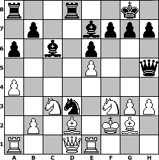 Partie-Notation im PGN-Format [Event "Oktober Gold"] [Site "www.mySchach.de"] [Date "2025.10.11"] [Round "1"] [White "alibengali"] [Black "deepsabel"] [ECO "A13"] [WhitemyELO "1715"] [BlackmyELO "1799"] [Result "0-1"] [TimeControl "10/1728000"] [WhiteDays "34"] [BlackDays "57"] [MySchachNr "133719"] 1. c4 e6 2. Nf3 d5 3. d4 Nf6 4. g3 Be7 5. Bg2 O-O 6. O-O dxc4 7. Qc2 a6 8. a4 Nc6 9. Qxc4 Qd5 10. Qd3 Nb4 11. Qd1 c5 12. Nc3 Qh5 13. dxc5 Qxc5 14. Bd2 Bd7 15. e4 Rfd8 16. Be3 Qa5 17. Bd2 Bc6 18. Re1 Qh5 19. e5 Ng4 20. h3 Nxf2 21. Kxf2 Nd3+ 0-1 Stellungs-Notation im FEN-Format r2r2k1/1p2bppp/p1b1p3/4P2q/P7/2Nn1NPP/1P1B1KB1/R2QR3 - - - 1 22 Geschlagene Figuren Weiss: Geschlagene Figuren Schwarz: Klicken Sie auf eine geschlagene Figur um den gewünschten Zug darzustellen!