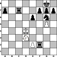 Partie-Notation im PGN-Format [Event "unter uns Nr. 30 (Weihnachtsturnier)"] [Site "www.mySchach.de"] [Date "2015.12.21"] [Round "1"] [White "Haneken"] [Black "Master1"] [ECO "B10"] [WhitemyELO "1087"] [BlackmyELO "1260"] [Result "0-1"] [TimeControl "10/2592000"] [WhiteDays "117"] [BlackDays "108"] [MySchachNr "101758"] 1. e4 c6 2. b4 d5 3. e5 Bf5 4. Bd3 Bxd3 5. cxd3 e6 6. Ba3 b5 7. Nf3 Na6 8. Nd4 Nxb4 9. Bxb4 Bxb4 10. Nxc6 Qg5 11. Nxb4 Qxe5+ 12. Kf1 Qxa1 13. Nc3 Qxd1+ 14. Nxd1 Ne7 15. Na6 O-O 16. Nc3 Rac8 17. g3 Nf5 18. Nxb5 Rc1+ 19. Kg2 Rc2 20. g4 Nh4+ 21. Kg3 Rxa2 22. Nbc7 Ng6 23. Nc5 Rxd2 24. Nd7 Rxd3+ 25. Kg2 Rd8 26. Nc5 Rc3 27. N5a6 Rd6 28. g5 d4 29. Kf1 d3 30. Ke1 Rc1+ 31. Kd2 Rxh1 32. Nc5 Rxh2 33. Nxd3 Rxf2+ 34. Kc3 Rc6+ 35. Kd4 Rxc7 0-1 Stellungs-Notation im FEN-Format 6k1/p1r2ppp/4p1n1/6P1/3K4/3N4/4Pr2/8 - - - 0 36 Geschlagene Figuren Weiss: Geschlagene Figuren Schwarz: Klicken Sie auf eine geschlagene Figur um den gewünschten Zug darzustellen!