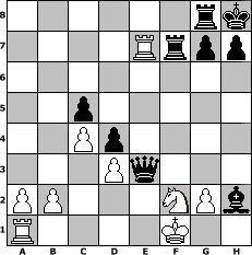 Partie-Notation im PGN-Format [Event "Grand Prix Angriff "] [Site "www.mySchach.de"] [Date "2016.11.29"] [Round "2"] [White "shan"] [Black "Knight"] [ECO "B21"] [WhitemyELO "1500"] [BlackmyELO "1245"] [Result "0-1"] [TimeControl "10/2592000"] [WhiteDays "120"] [BlackDays "090"] [MySchachNr "105892"] 1. e4 c5 2. f4 d6 3. Nf3 Nc6 4. c3 Nf6 5. Bb5 Nxe4 6. Bxc6+ bxc6 7. O-O Bg4 8. Qc2 d5 9. Ne5 Bd7 10. Nxd7 Qxd7 11. d3 Nf6 12. f5 e6 13. Re1 e5 14. c4 d4 15. Rxe5+ Be7 16. Qe2 Rb8 17. Rxc5 O-O 18. Re5 Bd6 19. Ra5 c5 20. Bg5 Qxf5 21. Bxf6 Qxf6 22. Rxa7 Rfe8 23. Qf2 Bxh2+ 24. Kf1 Qg5 25. Qxf7+ Kh8 26. Nd2 Rg8 27. Ne4 Qe3 28. Nf2 Rbf8 29. Re7 Rxf7 0-1 Stellungs-Notation im FEN-Format 6rk/4Rrpp/8/2p5/2Pp4/3Pq3/PP3NPb/R4K2 - - - 0 30 Geschlagene Figuren Weiss: Geschlagene Figuren Schwarz: Klicken Sie auf eine geschlagene Figur um den gewünschten Zug darzustellen!