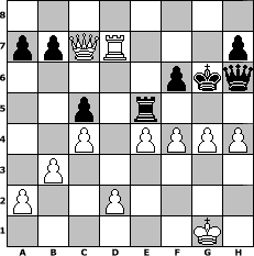 Partie-Notation im PGN-Format [Event "Abermals Aljechin"] [Site "www.mySchach.de"] [Date "2011.02.13"] [Round "2"] [White "kari6katz"] [Black "muellerh"] [ECO "A52"] [WhitemyELO "1796"] [BlackmyELO "1531"] [Result "1-0"] [TimeControl "10/1728000"] [WhiteDays "79"] [BlackDays "31"] [MySchachNr "71994"] 1. d4 Nf6 2. c4 e5 3. dxe5 Ng4 4. e4 d6 5. exd6 Bxd6 6. Be2 Ne5 7. Nc3 O-O 8. Nf3 Qe7 9. O-O Rd8 10. Qc2 Nbc6 11. Qb3 Nxf3+ 12. Bxf3 Nd4 13. Qd1 Be5 14. Nd5 Qh4 15. g3 Nxf3+ 16. Qxf3 Qh3 17. Ne7+ Kf8 18. Nxc8 Raxc8 19. Rb1 Rd6 20. Be3 c5 21. Bf4 Bxf4 22. Qxf4 Rcd8 23. b3 Rh6 24. g4 Rd3 25. f3 g5 26. Qb8+ Kg7 27. Qe5+ Rf6 28. Qxg5+ Rg6 29. Qe5+ f6 30. Qc7+ Kh6 31. Qf4+ Kg7 32. Rfd1 Rxd1+ 33. Rxd1 Rg5 34. Rd7+ Kg6 35. Qc7 Qh6 36. h4 Re5 37. f4 1-0 Stellungs-Notation im FEN-Format 8/ppQR3p/5pkq/2p1r3/2P1PPPP/1P6/P2P4/6K1 - - - 0 37 Geschlagene Figuren Weiss: Geschlagene Figuren Schwarz: Klicken Sie auf eine geschlagene Figur um den gewünschten Zug darzustellen!