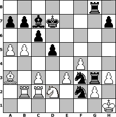 | Partie-Notation im PGN-Format [Event "Wintereinbruch"] [Site "www.mySchach.de"] [Date "2015.10.18"] [Round "1"] [White "reisinger"] [Black "Schefsche"] [ECO "A40"] [WhitemyELO "1425"] [BlackmyELO "1512"] [Result "0-1"] [TimeControl "10/1728000"] [WhiteDays "80"] [BlackDays "79"] [MySchachNr "100817"] 1. d4 e5 2. dxe5 d5 3. Nf3 Bg4 4. e3 Nc6 5. Be2 Bb4+ 6. c3 Bc5 7. h3 Bxf3 8. Bxf3 Nge7 9. O-O Nxe5 10. b4 Bb6 11. a4 c6 12. a5 Bc7 13. Be2 Qd6 14. f4 Nd7 15. Ba3 g5 16. Bh5 Nf5 17. Qf3 Nh4 18. Bxf7+ Kxf7 19. Qh5+ Ke7 20. Qxg5+ Qf6 21. Qxf6+ Nxf6 22. Nd2 Rag8 23. Rf2 Rg3 24. Nf1 Rg7 25. Rb1 Ne4 26. Rc2 Rhg8 27. Rbb2 Nf3+ 28. Kh1 Rg3 29. b5+ Kd7 30. Nd2 Nf2# 0-1 Stellungs-Notation im FEN-Format 6r1/ppbk3p/2p5/PP1p4/5P2/B1P1PnrP/1RRN1nP1/7K - - - 3 31 Geschlagene Figuren Weiss:                              Geschlagene Figuren Schwarz:                               Klicken Sie auf eine geschlagene Figur um den gewünschten Zug darzustellen!