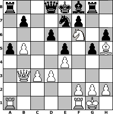 Partie-Notation im PGN-Format [Event "Einfach nur Schach 4"] [Site "www.mySchach.de"] [Date "2024.01.26"] [Round "2"] [White "Campino1986"] [Black "Andreas1954"] [ECO "C20"] [WhitemyELO "1477"] [BlackmyELO "1238"] [Result "1-0"] [TimeControl "10/864000"] [WhiteDays "15"] [BlackDays "20"] [MySchachNr "131480"] 1. e4 e5 2. d3 d6 3. Nf3 c5 4. Be2 Bg4 5. O-O Bxf3 6. Bxf3 Nc6 7. Nc3 Nf6 8. Bg5 h6 9. Bxf6 Qxf6 10. Nd5 Qd8 11. a3 Nd4 12. c3 Nc6 13. b4 cxb4 14. axb4 a5 15. b5 Ne7 16. Qb3 g5 17. Bh5 Rg8 18. Nf6# 1-0 Stellungs-Notation im FEN-Format r2qkbr1/1p2np2/3p1N1p/pP2p1pB/4P3/1QPP4/5PPP/R4RK1 - q - 3 18 Geschlagene Figuren Weiss: Geschlagene Figuren Schwarz: Klicken Sie auf eine geschlagene Figur um den gewünschten Zug darzustellen!