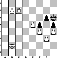 Partie-Notation im PGN-Format [Event "Neujahrsturnier"] [Site "www.mySchach.de"] [Date "2012.01.04"] [Round "1"] [White "Seneca"] [Black "Master1"] [ECO "D00"] [WhitemyELO "1398"] [BlackmyELO "1262"] [Result "1-0"] [TimeControl "10/1728000"] [WhiteDays "20"] [BlackDays "20"] [MySchachNr "78966"] 1. d4 d5 2. e3 Nf6 3. Nf3 Bf5 4. Bd3 Bxd3 5. cxd3 Nc6 6. O-O e6 7. a3 Bd6 8. b4 O-O 9. Nbd2 b5 10. Nb3 e5 11. dxe5 Nxe5 12. Nfd4 a6 13. Nf5 Nc6 14. Nxd6 Qxd6 15. Nc5 a5 16. Bd2 a4 17. g3 Nd7 18. Nxd7 Qxd7 19. Qc2 d4 20. Rac1 Ra6 21. e4 Ne5 22. Qxc7 Qxc7 23. Rxc7 Nxd3 24. Rb7 Re6 25. f3 Nb2 26. Rxb5 Nc4 27. Bc1 Nd6 28. Rd5 Rd8 29. Rxd4 Nb7 30. Rxd8+ Nxd8 31. Rd1 Re8 32. Be3 Nc6 33. Rd6 Ne5 34. Kg2 Nc4 35. Rd3 Nxe3+ 36. Rxe3 f5 37. e5 Kf7 38. Kf2 Ke6 39. f4 Rd8 40. Kf3 Rd2 41. h4 Rb2 42. Rd3 h5 43. Ke3 Rg2 44. Kd4 Re2 45. Kc5 Rb2 46. Kb5 Rb3 47. Kc4 Rb1 48. b5 g6 49. Kc5 Rb3 50. Rd6+ Kf7 51. b6 Rxa3 52. Kb4 Ra1 53. Rf6+ Kg7 54. Rc6 a3 55. Kb3 a2 56. Kb2 Rb1+ 57. Kxa2 Rb5 58. Rc7+ Kh6 59. b7 Rb2+ 60. Kxb2 1-0 Stellungs-Notation im FEN-Format 8/1PR5/6pk/4Pp1p/5P1P/6P1/1K6/8 - - - 0 60 Geschlagene Figuren Weiss: Geschlagene Figuren Schwarz: Klicken Sie auf eine geschlagene Figur um den gewünschten Zug darzustellen!