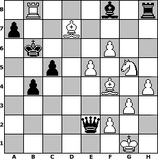Partie-Notation im PGN-Format [Event "Arpad Elo Geburtstagstunier"] [Site "www.mySchach.de"] [Date "2011.08.23"] [Round "1"] [White "deepsabel"] [Black "Erich"] [ECO "D15"] [WhitemyELO "2009"] [BlackmyELO "1926"] [Result "1-0"] [TimeControl "10/1728000"] [WhiteDays "20"] [BlackDays "20"] [MySchachNr "75689"] 1. d4 d5 2. c4 c6 3. Nf3 Nf6 4. Nc3 e6 5. Bg5 dxc4 6. e4 b5 7. e5 h6 8. Bh4 g5 9. Nxg5 hxg5 10. Bxg5 Nbd7 11. g3 Bb7 12. Bg2 Qb6 13. exf6 O-O-O 14. O-O Ne5 15. dxe5 Rxd1 16. Rfxd1 c5 17. Bf4 b4 18. Ne4 Bd5 19. Rd2 Qc6 20. Re1 Rg8 21. h4 Kb8 22. Rxd5 Qxd5 23. Nd6 Qd3 24. Be4 Qd4 25. Nxf7 c3 26. bxc3 Qxc3 27. Rd1 Kc7 28. Ng5 Qc4 29. Bg2 Qxa2 30. Bh3 Kc6 31. Bxe6 Qe2 32. Rd8 Rh8 33. Bd7+ Kb6 34. Rb8+ 1-0 Stellungs-Notation im FEN-Format 1R3b1r/p2B4/1k3P2/2p1P1N1/1p3B1P/6P1/4qP2/6K1 - - - 6 34 Geschlagene Figuren Weiss: Geschlagene Figuren Schwarz: Klicken Sie auf eine geschlagene Figur um den gewünschten Zug darzustellen!