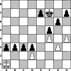 Partie-Notation im PGN-Format [Event "960 Chess Fun"] [Site "www.mySchach.de"] [Date "2006.03.14"] [Round "1"] [White "Schefsche"] [Black "Seneca"] [Variant "Fischerrandom"] [SetUp "1"] [FEN "nrnqkrbb/pppppppp/8/8/8/8/PPPPPPPP/NRNQKRBB w KQkq - 0 1"] [WhitemyELO "1404"] [BlackmyELO "1825"] [Result "0-1"] [TimeControl "10/864000"] [WhiteDays "01"] [BlackDays "09"] [MySchachNr "23557"] 1. f4 d5 2. Bd4 c6 3. g3 Nab6 4. Ncb3 f6 5. Nc5 Bf7 6. Bf3 Nd6 7. b3 a6 8. Bg4 g6 9. Be6 Ne4 10. Bxf7+ Kxf7 11. Nxe4 dxe4 12. Bxb6 Qxb6 13. e3 Rfd8 14. c4 Rd7 15. Rf2 Rbd8 16. Nc2 Qa5 17. a4 f5 18. h4 Bc3 19. b4 Qxa4 20. Ra1 Qb3 21. Ra3 Qxc4 22. Rxc3 Qxc3 23. Nd4 Qxb4 24. Qb3+ Qxb3 25. Nxb3 b6 26. Nd4 Rxd4 27. exd4 Rxd4 28. Re2 a5 29. Re3 Rd3 30. Rxd3 exd3 31. Kd1 a4 32. Kc1 b5 33. Kb2 b4 34. Kb1 a3 35. Ka2 c5 36. Ka1 b3 37. Kb1 c4 38. Ka1 c3 0-1 Stellungs-Notation im FEN-Format 8/4pk1p/6p1/5p2/5P1P/pppp2P1/3P4/K7 - - - 0 39 Geschlagene Figuren Weiss: Geschlagene Figuren Schwarz: Klicken Sie auf eine geschlagene Figur um den gewünschten Zug darzustellen!