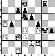 Partie-Notation im PGN-Format [Event "April April April"] [Site "www.mySchach.de"] [Date "2016.04.15"] [Round "1"] [White "Erich"] [Black "Peterlie77 (C)"] [Variant "Fischerrandom"] [SetUp "1"] [FEN "rqnnkrbb/pppppppp/8/8/8/8/PPPPPPPP/RQNNKRBB w KQkq - 0 1"] [WhitemyELO "2116"] [BlackmyELO "2108"] [Result "1/2-1/2"] [TimeControl "10/2592000"] [WhiteDays "90"] [BlackDays "81"] [MySchachNr "103292"] 1. e4 g6 2. c3 f5 3. exf5 gxf5 4. f4 Bd5 5. Ne3 Be4 6. d3 Bc6 7. Ne2 b5 8. Bf2 Ne6 9. Qc2 Nd6 10. Bh4 Qb7 11. Kf2 a5 12. Kg1 Rf7 13. a3 O-O-O 14. b4 Rg8 15. bxa5 Qa8 16. Ra2 Bf6 17. Bxf6 Rxf6 18. Qb3 Rfg6 19. Nd4 Nxd4 20. cxd4 e6 21. Rc2 h5 22. Qc3 h4 23. Kf2 Kd8 24. Rcc1 Bxg2 25. Nxg2 Rxg2+ 26. Bxg2 Qxg2+ 27. Ke1 Qxh2 28. Rf2 Qg3 29. Ke2 Qg4+ 1/2-1/2 Stellungs-Notation im FEN-Format 3k2r1/2pp4/3np3/Pp3p2/3P1Pqp/P1QP4/4KR2/2R5 - - - 4 30 Geschlagene Figuren Weiss: Geschlagene Figuren Schwarz: Klicken Sie auf eine geschlagene Figur um den gewünschten Zug darzustellen!