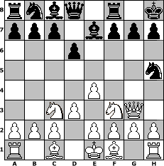 Partie-Notation im PGN-Format [Event "Turnier in den M"] [Site "www.mySchach.de"] [Date "2014.02.19"] [Round "1"] [White "Mattheus"] [Black "augustus"] [ECO "C20"] [WhitemyELO "1218"] [BlackmyELO "1341"] [Result "0-1"] [TimeControl "10/2592000"] [WhiteDays "26"] [BlackDays "30"] [MySchachNr "93107"] 1. e4 e5 2. Qh5 Nf6 3. Qxe5+ Be7 4. Nf3 O-O 5. d3 d6 6. Qg3 Kh8 7. Nc3 Nh5 0-1 Stellungs-Notation im FEN-Format rnbq1r1k/ppp1bppp/3p4/7n/4P3/2NP1NQ1/PPP1PPPP/R1B1KB1R - KQ - 4 8 Geschlagene Figuren Weiss: Geschlagene Figuren Schwarz: Klicken Sie auf eine geschlagene Figur um den gewünschten Zug darzustellen!