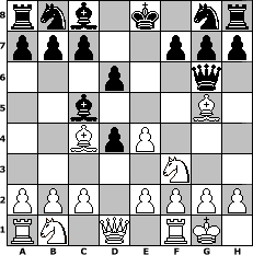 | Partie-Notation im PGN-Format [Event "Ist den schon Herbst?"] [Site "www.mySchach.de"] [Date "2014.09.05"] [Round "2"] [White "Schefsche"] [Black "alpacino"] [ECO "C21"] [WhitemyELO "1378"] [BlackmyELO "1304"] [Result "0-1"] [TimeControl "10/2592000"] [WhiteDays "00"] [BlackDays "27"] [MySchachNr "95767"] 1. e4 e5 2. d4 exd4 3. Bc4 Qf6 4. Nf3 Bc5 5. O-O d6 6. Bg5 Qg6 0-1 Stellungs-Notation im FEN-Format rnb1k1nr/ppp2ppp/3p2q1/2b3B1/2BpP3/5N2/PPP1PPPP/RN1Q1RK1 - kq - 2 7 Geschlagene Figuren Weiss:                              Geschlagene Figuren Schwarz:                               Klicken Sie auf eine geschlagene Figur um den gewünschten Zug darzustellen!