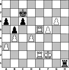 Partie-Notation im PGN-Format [Event "JasWi-1"] [Site "www.mySchach.de"] [Date "2015.08.21"] [Round "1"] [White "Vahl1"] [Black "sinnlos"] [ECO "D00"] [WhitemyELO "1738"] [BlackmyELO "1529"] [Result "1-0"] [TimeControl "10/2592000"] [WhiteDays "30"] [BlackDays "30"] [MySchachNr "100128"] 1. d4 d5 2. Bg5 h6 3. Bh4 Nd7 4. Nc3 c6 5. Nf3 Ngf6 6. e3 e6 7. a3 a6 8. Be2 Be7 9. O-O Qc7 10. Re1 Bd6 11. h3 g5 12. Bg3 Bxg3 13. fxg3 Qxg3 14. Bd3 Qd6 15. b4 b5 16. e4 dxe4 17. Nxe4 Nxe4 18. Bxe4 Bb7 19. c3 O-O-O 20. Rf1 f5 21. Bc2 g4 22. Ne5 Nxe5 23. dxe5 Qxe5 24. Qe1 Qxe1 25. Raxe1 Rd6 26. Bb3 Kd7 27. hxg4 Rg8 28. gxf5 Ke7 29. Bxe6 Rb8 30. Rf3 Kd8 31. Rh3 Kc7 32. Rxh6 Bc8 33. g4 Bxe6 34. Rhxe6 Rg8 35. R1e4 Rd1+ 36. Kf2 Rd8 37. g5 R8d2+ 38. Re2 Rd5 39. R6e5 R5d4 40. g6 Rh1 41. cxd4 1-0 Stellungs-Notation im FEN-Format 8/2k5/p1p3P1/1p2RP2/1P1P4/P7/4RK2/7r - - - 0 41 Geschlagene Figuren Weiss: Geschlagene Figuren Schwarz: Klicken Sie auf eine geschlagene Figur um den gewünschten Zug darzustellen!