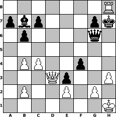 Partie-Notation im PGN-Format [Event "Kleines Gepl"] [Site "www.mySchach.de"] [Date "2009.10.13"] [Round "2"] [White "Sanji"] [Black "muellerh"] [ECO "C01"] [WhitemyELO "1459"] [BlackmyELO "1478"] [Result "1-0"] [TimeControl "10/2592000"] [WhiteDays "112"] [BlackDays "085"] [MySchachNr "59814"] 1. e4 e6 2. d4 d5 3. c4 dxe4 4. Nc3 Nf6 5. f3 exf3 6. Nxf3 Be7 7. Bd3 O-O 8. O-O b6 9. Ne4 Bb7 10. Nxf6+ Bxf6 11. Be3 Nc6 12. Kh1 Qe7 13. Rf2 Rad8 14. Qd2 Rd7 15. Bg5 Nxd4 16. Bxf6 Qxf6 17. Ng5 Qd8 18. Nxh7 Nb3 19. axb3 Rxd3 20. Qf4 Kxh7 21. Qg4 Rd4 22. Qh5+ Kg8 23. Raf1 Rh4 24. Qe5 Qe7 25. Rf4 Rxf4 26. Rxf4 Rd8 27. h3 Rd2 28. Rg4 f6 29. Qf4 e5 30. Qxd2 f5 31. Rg3 f4 32. Rd3 e4 33. Rd7 Qg5 34. b4 e3 35. Rd8+ Kh7 36. Qd3+ Qg6 37. Rh8+ 1-0 Stellungs-Notation im FEN-Format 7R/pbp3pk/1p4q1/8/1PP2p2/3Qp2P/1P2P1P1/7K - - - 5 37 Geschlagene Figuren Weiss: Geschlagene Figuren Schwarz: Klicken Sie auf eine geschlagene Figur um den gewünschten Zug darzustellen!