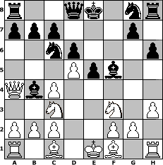 Partie-Notation im PGN-Format [Event "Herbstturnier 2022"] [Site "www.mySchach.de"] [Date "2022.09.26"] [Round "1"] [White "Leon"] [Black "Mynona"] [ECO "A21"] [WhitemyELO "1632"] [BlackmyELO "1445"] [Result "1-0"] [TimeControl "10/1728000"] [WhiteDays "20"] [BlackDays "20"] [MySchachNr "127271"] 1. c4 e5 2. Nc3 Bc5 3. e4 d6 4. Nf3 h6 5. h3 f5 6. exf5 Bxf5 7. d4 Bb4 8. Qa4+ Nc6 9. d5 1-0 Stellungs-Notation im FEN-Format r2qk1nr/ppp3p1/2np3p/3Ppb2/QbP5/2N2N1P/PPP2PP1/R1B1KB1R - KQkq - 0 9 Geschlagene Figuren Weiss: Geschlagene Figuren Schwarz: Klicken Sie auf eine geschlagene Figur um den gewünschten Zug darzustellen!
