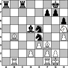 Partie-Notation im PGN-Format [Event "960-Sommerturnier 2025"] [Site "www.mySchach.de"] [Date "2025.08.01"] [Round "1"] [White "jeremyt"] [Black "larlinde"] [Variant "Fischerrandom"] [SetUp "1"] [FEN "qnnbbrkr/pppppppp/8/8/8/8/PPPPPPPP/QNNBBRKR w KQkq - 0 1"] [WhitemyELO "2102"] [BlackmyELO "2168"] [Result "1-0"] [TimeControl "10/2592000"] [WhiteDays "21"] [BlackDays "00"] [MySchachNr "133554"] 1. d4 b5 2. a4 d5 3. axb5 Bxb5 4. Nc3 Bc6 5. e3 Nd6 6. Nd3 Nd7 7. Ne2 e6 8. h4 Be7 9. Nef4 Bb5 10. b3 Rb8 11. Bf3 Ne4 12. c4 dxc4 13. bxc4 Bxc4 14. Ba5 O-O 15. Bxc7 Rbc8 16. Ba5 Bd6 17. Rb1 Bxf4 18. Nxf4 h6 19. Bb4 Rfe8 20. Nh5 Qd5 21. Qxa7 Ra8 22. Qc7 e5 23. dxe5 Rec8 24. Qd6 Nxe5 25. Qxd5 Bxd5 26. O-O 1-0 Stellungs-Notation im FEN-Format r1r3k1/5pp1/7p/3bn2N/1B2n2P/4PB2/3P1PP1/1R3RK1 - - - 1 26 Geschlagene Figuren Weiss: Geschlagene Figuren Schwarz: Klicken Sie auf eine geschlagene Figur um den gewünschten Zug darzustellen!