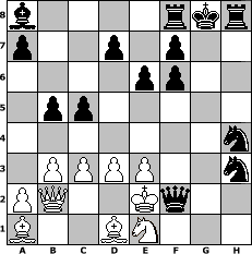 Partie-Notation im PGN-Format [Event "Siebenschl"] [Site "www.mySchach.de"] [Date "2009.07.07"] [Round "1"] [White "rikilatic"] [Black "schobu2001"] [Variant "Fischerrandom"] [SetUp "1"] [FEN "bqnbnrkr/pppppppp/8/8/8/8/PPPPPPPP/BQNBNRKR w KQkq - 0 1"] [WhitemyELO "1445"] [BlackmyELO "1730"] [Result "0-1"] [TimeControl "10/2592000"] [WhiteDays "60"] [BlackDays "54"] [MySchachNr "57230"] 1. b3 Nf6 2. Qb2 e6 3. Ncd3 b5 4. Nf4 c5 5. h4 Qxf4 6. e3 Qc7 7. Rh3 Nd6 8. Rg3 Nf5 9. Rh3 Ne4 10. g4 Bf6 11. c3 Nxh4 12. f4 h6 13. g5 hxg5 14. fxg5 Nxg5 15. Rxf6 Nxh3+ 16. Kf1 gxf6 17. d3 Qg3 18. Ke2 Qf2# 0-1 Stellungs-Notation im FEN-Format b4rkr/p2p1p2/4pp2/1pp5/7n/1PPPP2n/PQ2Kq2/B2BN3 - kq - 3 19 Geschlagene Figuren Weiss: Geschlagene Figuren Schwarz: Klicken Sie auf eine geschlagene Figur um den gewünschten Zug darzustellen!