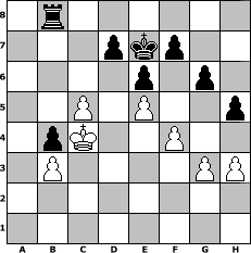Partie-Notation im PGN-Format [Event "Turnier zum Winterende"] [Site "www.mySchach.de"] [Date "2006.02.18"] [Round "2"] [White "Basal"] [Black "nogumo"] [ECO "A45"] [WhitemyELO "2002"] [BlackmyELO "1666"] [Result "0-1"] [TimeControl "10/2592000"] [WhiteDays "141"] [BlackDays "147"] [MySchachNr "22627"] 1. d4 Nf6 2. f3 e6 3. e4 c5 4. Nh3 cxd4 5. Bd3 Bb4+ 6. Bd2 Bxd2+ 7. Nxd2 Nc6 8. O-O O-O 9. f4 Nb4 10. Qe2 Nxd3 11. Qxd3 Qb6 12. Ng5 g6 13. e5 Nd5 14. Nc4 Qc6 15. Qh3 h5 16. Qd3 Ne3 17. Ne4 Qxc4 18. Qxc4 Nxc4 19. Rad1 Ne3 20. Rxd4 Nxf1 21. Kxf1 b6 22. Nf6+ Kg7 23. Rd6 Ba6+ 24. Ke1 Bb5 25. b3 Rfd8 26. c4 Bc6 27. g3 b5 28. c5 b4 29. Ke2 a5 30. Rd2 a4 31. Kd3 axb3 32. axb3 Bb5+ 33. Kd4 Ra3 34. Rb2 Rc8 35. Ne4 Ra1 36. Rd2 Rb8 37. Nd6 Bc6 38. Nc4 Rb1 39. Rb2 Rxb2 40. Nxb2 Bd5 41. Nc4 Bxc4 42. Kxc4 Kf8 43. h3 Ke7 0-1 Stellungs-Notation im FEN-Format 1r6/3pkp2/4p1p1/2P1P2p/1pK2P2/1P4PP/8/8 - - - 1 44 Geschlagene Figuren Weiss: Geschlagene Figuren Schwarz: Klicken Sie auf eine geschlagene Figur um den gewünschten Zug darzustellen!