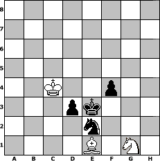 Partie-Notation im PGN-Format [Event "11er3"] [Site "www.mySchach.de"] [Date "2024.02.15"] [Round "1"] [White "spiderman"] [Black "deepsabel"] [ECO "A06"] [WhitemyELO "1831"] [BlackmyELO "1778"] [Result "0-1"] [TimeControl "10/3456000"] [WhiteDays "38"] [BlackDays "40"] [MySchachNr "131537"] 1. Nf3 d5 2. e3 Bg4 3. h3 Bh5 4. g4 Bg6 5. h4 h5 6. Ne5 Qd6 7. d4 Nc6 8. Nxg6 Qxg6 9. gxh5 Qxh5 10. Qxh5 Rxh5 11. Be2 Rh8 12. Bd2 Nf6 13. Nc3 O-O-O 14. O-O-O e6 15. h5 a6 16. Kb1 Bd6 17. Rh3 Rh7 18. Rdh1 Rdh8 19. b3 g6 20. h6 Bf8 21. Rf3 Ng8 22. Kb2 Bxh6 23. Rfh3 Nf6 24. a3 Bg7 25. Rxh7 Rxh7 26. Rxh7 Nxh7 27. Na4 Bf8 28. c4 Kd7 29. cxd5 exd5 30. b4 Nf6 31. Nc5+ Bxc5 32. bxc5 Ne4 33. Be1 f5 34. f3 Ng5 35. f4 Ne4 36. Bd3 Nf6 37. Kc3 Ng4 38. Kd2 Na5 39. a4 Kc6 40. Ke2 Nc4 41. Bd2 b6 42. cxb6 cxb6 43. Bc2 b5 44. Bb3 Nf6 45. Bb4 Ne4 46. Be1 Nb6 47. axb5+ Kxb5 48. Bc2 a5 49. Bh4 a4 50. Be7 Kc4 51. Kd1 Kc3 52. Kc1 Nc4 53. Bxa4 Nxe3 54. Be8 Kxd4 55. Bxg6 Kc3 56. Bd8 Kd3 57. Kb2 Ng3 58. Be8 Ne2 59. Bb5+ Nc4+ 60. Kb3 Nd4+ 61. Kb4 Nxb5 62. Kxb5 Ke4 63. Kc5 Ne3 64. Bf6 Ng2 65. Kd6 Nxf4 66. Kc6 d4 67. Kc5 d3 68. Bc3 Ne2 69. Be1 f4 70. Kc4 Ke3 0-1 Stellungs-Notation im FEN-Format 8/8/8/8/2K2p2/3pk3/4n3/4B1N1 - - - 2 71 Geschlagene Figuren Weiss: Geschlagene Figuren Schwarz: Klicken Sie auf eine geschlagene Figur um den gewünschten Zug darzustellen!