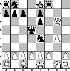 Partie-Notation im PGN-Format [Event "Hauptsache SPASS"] [Site "www.mySchach.de"] [Date "2003.11.30"] [Round "1"] [White "Sanji"] [Black "escaped"] [ECO "B01"] [WhitemyELO "1328"] [BlackmyELO "1404"] [Result "1-0"] [TimeControl "10/2592000"] [WhiteDays "47"] [BlackDays "40"] [MySchachNr "1521"] 1. e4 d5 2. exd5 Qxd5 3. Nc3 Qd8 4. Bc4 Be6 5. Bxe6 fxe6 6. Qh5+ g6 7. Qe5 Nf6 8. g4 Bg7 9. Ne4 Nxe4 10. Qxg7 Rf8 11. Qxh7 Qd5 12. Qxg6+ 1-0 Stellungs-Notation im FEN-Format rn2kr2/ppp1p3/4p1Q1/3q4/4n1P1/8/PPPPPP1P/R1B1K1NR - KQq - 0 12 Geschlagene Figuren Weiss: ![]() ![]() ![]() ![]() ![]() ![]() ![]() ![]() ![]() ![]() ![]() ![]() ![]() ![]() ![]() Geschlagene Figuren Schwarz: ![]() ![]() ![]() ![]() ![]() ![]() ![]() ![]() ![]() ![]() ![]() ![]() ![]() ![]() ![]() Klicken Sie auf eine geschlagene Figur um den gewünschten Zug darzustellen!
