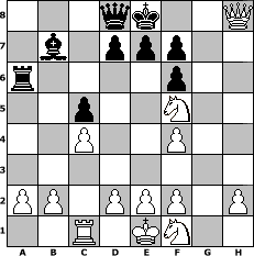 Partie-Notation im PGN-Format [Event "960 ChessSpa"] [Site "www.mySchach.de"] [Date "2005.11.11"] [Round "2"] [White "bane"] [Black "stierdame1965"] [Variant "Fischerrandom"] [SetUp "1"] [FEN "bbrqknrn/pppppppp/8/8/8/8/PPPPPPPP/BBRQKNRN w KQkq - 0 1"] [WhitemyELO "1829"] [BlackmyELO "1065"] [Result "1-0"] [TimeControl "10/2592000"] [WhiteDays "60"] [BlackDays "60"] [MySchachNr "19471"] 1. b4 Ne6 2. c4 c5 3. b5 a6 4. Qa4 Bf4 5. Bxh7 Kf8 6. g3 Ng5 7. gxf4 Nxh7 8. bxa6 bxa6 9. Qxa6 Nf6 10. Bxf6 gxf6 11. Rxg8+ Kxg8 12. Nhg3 Rc6 13. Qa3 Bb7 14. Nf5 Ra6 15. Qg3+ Kf8 16. Qg7+ Ke8 17. Qxh8# 1-0 Stellungs-Notation im FEN-Format 3qk2Q/1b1ppp2/r4p2/2p2N2/2P2P2/8/PP1PPP1P/2R1KN2 - Q - 0 17 Geschlagene Figuren Weiss: ![]() ![]() ![]() ![]() ![]() ![]() ![]() ![]() ![]() ![]() ![]() ![]() ![]() ![]() ![]() Geschlagene Figuren Schwarz: ![]() ![]() ![]() ![]() ![]() ![]() ![]() ![]() ![]() ![]() ![]() ![]() ![]() ![]() ![]() Klicken Sie auf eine geschlagene Figur um den gewünschten Zug darzustellen!