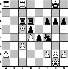 Partie-Notation im PGN-Format [Event "2. gro"] [Site "www.mySchach.de"] [Date "2005.09.19"] [Round "2"] [Board "3"] [White "BirdofPray1"] [Black "Look"] [ECO "A56"] [WhitemyELO "1882"] [BlackmyELO "1691"] [Result "1-0"] [TimeControl "10/3456000"] [WhiteDays "37"] [BlackDays "40"] [MySchachNr "17531"] 1. d4 Nf6 2. c4 c5 3. e3 cxd4 4. exd4 d5 5. Nf3 e6 6. Nc3 Bb4 7. c5 Bxc3+ 8. bxc3 O-O 9. Qc2 Nc6 10. Bd3 b6 11. Ba3 bxc5 12. Bxc5 Re8 13. O-O Qa5 14. Ng5 g6 15. Qd2 e5 16. Rab1 e4 17. Qf4 Bf5 18. Bb5 Rac8 19. Bxc6 Rxc6 20. Rb7 Nh5 21. Qe3 Rf6 22. Rxa7 Ra6 23. Rb7 f6 24. Nf7 Bc8 25. Nh6+ Kh8 26. Rb2 Qc7 27. Rfb1 Qf4 28. Nf7+ Kg8 29. Nd6 Rd8 30. Qxf4 Nxf4 31. Rb8 Rc6 32. Ra8 h6 33. Rbb8 Rdxd6 34. Rxc8+ 1-0 Stellungs-Notation im FEN-Format R1R3k1/8/2rr1ppp/2Bp4/3Ppn2/2P5/P4PPP/6K1 - - - 0 34 Geschlagene Figuren Weiss: Geschlagene Figuren Schwarz: Klicken Sie auf eine geschlagene Figur um den gewünschten Zug darzustellen!