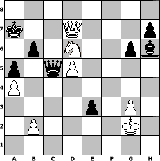Partie-Notation im PGN-Format [Event "Es wird bald Sommer"] [Site "www.mySchach.de"] [Date "2015.05.12"] [Round "1"] [White "muellerh"] [Black "Gordholm"] [ECO "E90"] [WhitemyELO "1522"] [BlackmyELO "1499"] [Result "1-0"] [TimeControl "10/2592000"] [WhiteDays "30"] [BlackDays "30"] [MySchachNr "99215"] 1. d4 Nf6 2. c4 g6 3. Nc3 Bg7 4. e4 d6 5. Nf3 O-O 6. Bd3 Nbd7 7. O-O e5 8. d5 a5 9. a4 Nc5 10. Be3 Nxd3 11. Qxd3 Nh5 12. Qd2 f5 13. exf5 Bxf5 14. h3 Bxh3 15. Bh6 Nf4 16. Bg5 Qd7 17. Rfe1 Qg4 18. Nh4 Qxg5 19. g3 Bf5 20. Kh2 Qg4 21. Rh1 Nh3 22. f3 Qxc4 23. Nxf5 Rxf5 24. Kxh3 Rxf3 25. Rac1 Qb3 26. Kg2 Raf8 27. Rhf1 Rxf1 28. Rxf1 Rxf1 29. Kxf1 Qc4+ 30. Kg2 e4 31. Nb5 b6 32. Qg5 Qe2+ 33. Kg1 e3 34. Qd8+ Bf8 35. Qf6 Qd2 36. Qe6+ Kg7 37. Qd7+ Kh8 38. Qf7 Bh6 39. Qf6+ Kg8 40. Qe6+ Kf8 41. Qf6+ Ke8 42. Nxc7+ Kd7 43. Qf7+ Kc8 44. Nb5 Qc1+ 45. Kg2 Qc5 46. Qe8+ Kb7 47. Qd7+ Kb8 48. Qd8+ Kb7 49. Nxd6+ Ka7 50. Qd7+ 1-0 Stellungs-Notation im FEN-Format 8/k2Q3p/1p1N2pb/p1qP4/P7/4p1P1/1P4K1/8 - - - 2 50 Geschlagene Figuren Weiss: Geschlagene Figuren Schwarz: Klicken Sie auf eine geschlagene Figur um den gewünschten Zug darzustellen!