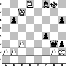 | Partie-Notation im PGN-Format [Event "B07 - Pirc Verteidigung"] [Site "www.mySchach.de"] [Date "2008.07.01"] [Round "1"] [White "Caligula"] [Black "andreas007"] [ECO "B08"] [WhitemyELO "1478"] [BlackmyELO "1376"] [Result "0-1"] [TimeControl "10/2592000"] [WhiteDays "149"] [BlackDays "150"] [MySchachNr "46024"] 1. e4 d6 2. d4 Nf6 3. Nc3 g6 4. Nf3 c6 5. Bc4 Bg7 6. Ng5 d5 7. exd5 cxd5 8. Bd3 Nc6 9. Be3 O-O 10. O-O h6 11. Nf3 Bg4 12. Be2 Ne4 13. Nxe4 dxe4 14. Nd2 Bxe2 15. Qxe2 f5 16. c3 e5 17. d5 Qxd5 18. Rfd1 Qe6 19. Nb3 b6 20. f4 exf4 21. Bxf4 Rad8 22. h3 Rd5 23. Rxd5 Qxd5 24. Rd1 Qf7 25. Rf1 Rd8 26. Qf2 g5 27. Bd2 Ne5 28. Bc1 f4 29. Qe2 e3 30. Bxe3 Nd3 31. Nd4 Qg6 32. Bf2 Nxf2 33. Rxf2 Re8 34. Qf3 Re3 35. Qa8+ Bf8 36. Qxa7 Re1+ 37. Kh2 Bd6 38. Nf3 Bc5 39. Rd2 g4 40. Rd8+ Bf8 41. Nxe1 gxh3 42. Qc7 Qg3+ 43. Kg1 Qxe1+ 44. Kh2 Qg3+ 0-1 Stellungs-Notation im FEN-Format 3R1bk1/2Q5/1p5p/8/5p2/2P3qp/PP4PK/8 - - - 2 45 Geschlagene Figuren Weiss:                              Geschlagene Figuren Schwarz:                               Klicken Sie auf eine geschlagene Figur um den gewünschten Zug darzustellen!