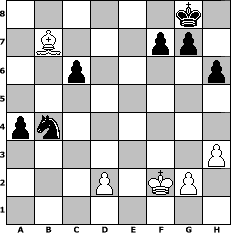 Partie-Notation im PGN-Format [Event "1-2009"] [Site "www.mySchach.de"] [Date "2009.01.01"] [Round "1"] [White "werderfan"] [Black "JerryWho"] [ECO "D60"] [WhitemyELO "1472"] [BlackmyELO "1575"] [Result "0-1"] [TimeControl "10/1728000"] [WhiteDays "76"] [BlackDays "35"] [MySchachNr "51210"] 1. d4 d5 2. c4 e6 3. Nc3 Nf6 4. Bg5 Be7 5. e3 O-O 6. Nf3 Nbd7 7. Bd3 Re8 8. O-O c6 9. cxd5 exd5 10. Qc2 Nf8 11. h3 Qc7 12. Rfe1 Bd7 13. Ne5 Be6 14. Bxf6 Bxf6 15. e4 Rad8 16. exd5 Bxd5 17. Nxd5 Rxd5 18. f4 Rxd4 19. Re4 Rxe4 20. Bxe4 Bxe5 21. fxe5 Qxe5 22. Re1 Ng6 23. Re2 h6 24. Bf3 Qd4+ 25. Kh1 Rxe2 26. Bxe2 Nf4 27. Bf3 Qd3 28. Qxd3 Nxd3 29. b3 Nc1 30. Bg4 Nxa2 31. Bc8 b5 32. Bb7 Nb4 33. Kg1 a5 34. Kf2 a4 35. bxa4 bxa4 0-1 Stellungs-Notation im FEN-Format 6k1/1B3pp1/2p4p/8/pn6/7P/3P1KP1/8 - - - 0 36 Geschlagene Figuren Weiss: Geschlagene Figuren Schwarz: Klicken Sie auf eine geschlagene Figur um den gewünschten Zug darzustellen!