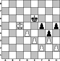 Partie-Notation im PGN-Format [Event "Herbstturnier 2022"] [Site "www.mySchach.de"] [Date "2022.09.26"] [Round "1"] [White "deepsabel"] [Black "lotchi"] [ECO "D21"] [WhitemyELO "1773"] [BlackmyELO "1263"] [Result "1-0"] [TimeControl "10/1728000"] [WhiteDays "65"] [BlackDays "76"] [MySchachNr "127272"] 1. d4 d5 2. c4 dxc4 3. Nf3 Bg4 4. e3 b5 5. a4 c6 6. Be2 Bxf3 7. Bxf3 a6 8. axb5 Qb6 9. bxa6 Rxa6 10. Rxa6 Qxa6 11. O-O e6 12. Qc2 f5 13. b3 cxb3 14. Qxb3 Qc8 15. Nd2 h5 16. Nc4 Nf6 17. Ne5 Nd5 18. Ng6 Rh6 19. Nxf8 Kxf8 20. Ba3+ Kg8 21. Bd6 Nd7 22. Rc1 N7f6 23. Qa4 Ne8 24. Be5 g6 25. Qxc6 Qxc6 26. Rxc6 g5 27. Bxd5 Kf7 28. Bc4 g4 29. g3 Rg6 30. Kf1 Ke7 31. Ke2 Rh6 32. Rxe6+ Rxe6 33. Bxe6 Kxe6 34. Kd3 Nf6 35. Bxf6 Kxf6 36. Kc4 Ke6 37. Kc5 1-0 Stellungs-Notation im FEN-Format 8/8/4k3/2K2p1p/3P2p1/4P1P1/5P1P/8 - - - 3 37 Geschlagene Figuren Weiss: Geschlagene Figuren Schwarz: Klicken Sie auf eine geschlagene Figur um den gewünschten Zug darzustellen!