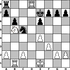 Partie-Notation im PGN-Format [Event "Laskers Erben"] [Site "www.mySchach.de"] [Date "2006.03.04"] [Round "2"] [White "bopl"] [Black "Juliette2103"] [ECO "A46"] [WhitemyELO "1869"] [BlackmyELO "2094"] [Result "1/2-1/2"] [TimeControl "10/2592000"] [WhiteDays "18"] [BlackDays "29"] [MySchachNr "23203"] 1. d4 Nf6 2. Nf3 d5 3. Bg5 Ne4 4. Bh4 c5 5. e3 Qb6 6. Nc3 Nxc3 7. bxc3 Qb2 8. Kd2 cxd4 9. Nxd4 Qb6 10. Qh5 e6 11. Bd3 Be7 12. Bxe7 Kxe7 13. Rab1 Qc7 14. Qg5+ Kf8 15. Nb5 Qd7 16. Qf4 Na6 17. Rhd1 b6 18. Ke1 Bb7 19. c4 Nc5 20. Qd6+ Qxd6 21. Nxd6 Bc6 22. cxd5 Bxd5 23. e4 Bc6 24. f3 Ke7 25. Bb5 Bxb5 26. Nxb5 Rhd8 27. Rxd8 1/2-1/2 Stellungs-Notation im FEN-Format r2R4/p3kppp/1p2p3/1Nn5/4P3/5P2/P1P3PP/1R2K3 - - - 0 27 Geschlagene Figuren Weiss: Geschlagene Figuren Schwarz: Klicken Sie auf eine geschlagene Figur um den gewünschten Zug darzustellen!