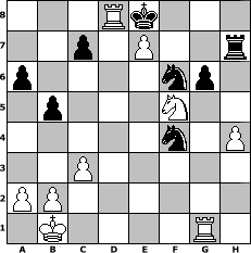 Partie-Notation im PGN-Format [Event "Winterende2014"] [Site "www.mySchach.de"] [Date "2014.03.06"] [Round "2"] [White "Andylein1989"] [Black "borsti"] [ECO "C41"] [WhitemyELO "1401"] [BlackmyELO "1202"] [Result "1-0"] [TimeControl "10/1728000"] [WhiteDays "100"] [BlackDays "100"] [MySchachNr "93402"] 1. e4 e5 2. Nf3 d6 3. Bc4 a6 4. d3 b5 5. Bb3 Bg4 6. Bxf7+ Kxf7 7. Ng5+ Ke8 8. Qxg4 Nf6 9. Qe6+ Qe7 10. Qc8+ Qd8 11. Qxd8+ Kxd8 12. Nf7+ Ke8 13. Nxh8 Be7 14. Bg5 Nh5 15. Bxe7 Kxe7 16. Nd2 Nd7 17. Ng6+ hxg6 18. O-O-O Rf8 19. Rhf1 Nf4 20. g3 Ne2+ 21. Kb1 Nd4 22. f4 exf4 23. Rxf4 Rh8 24. h4 Ne5 25. c3 Ne2 26. Rf2 Nxg3 27. Rg1 Nh5 28. d4 Nd7 29. Rxg6 Ndf6 30. Nf1 Ne8 31. Ne3 Nhf6 32. Nf5+ Kf7 33. Rfg2 Rh7 34. e5 dxe5 35. dxe5 Nh5 36. e6+ Kf8 37. Rf2 Nef6 38. Rd2 Ke8 39. Rg1 Nf4 40. e7 g6 41. Rd8+ 1-0 Stellungs-Notation im FEN-Format 3Rk3/2p1P2r/p4np1/1p3N2/5n1P/2P5/PP6/1K4R1 - - - 1 41 Geschlagene Figuren Weiss: Geschlagene Figuren Schwarz: Klicken Sie auf eine geschlagene Figur um den gewünschten Zug darzustellen!