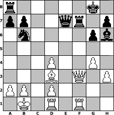 Partie-Notation im PGN-Format [Event "Albspiele 6"] [Site "www.mySchach.de"] [Date "2010.10.31"] [Round "1"] [White "espero"] [Black "Naunhofer"] [ECO "D00"] [WhitemyELO "1575"] [BlackmyELO "1608"] [Result "0-1"] [TimeControl "10/1728000"] [WhiteDays "20"] [BlackDays "20"] [MySchachNr "69432"] 1. d4 d5 2. e4 dxe4 3. Nc3 Nf6 4. f3 exf3 5. Nxf3 Bg4 6. h3 Bxf3 7. Qxf3 c6 8. Be3 e6 9. Bd3 Nbd7 10. O-O-O Be7 11. g4 Nd5 12. Nxd5 cxd5 13. Kb1 g6 14. Bh6 Bf8 15. Rhf1 Qe7 16. c4 Bxh6 17. cxd5 O-O 18. dxe6 Nb6 19. exf7+ Rxf7 0-1 Stellungs-Notation im FEN-Format r5k1/pp2qr1p/1n4pb/8/3P2P1/3B1Q1P/PP1P4/1K1R1R2 - - - 0 20 Geschlagene Figuren Weiss: Geschlagene Figuren Schwarz: Klicken Sie auf eine geschlagene Figur um den gewünschten Zug darzustellen!
